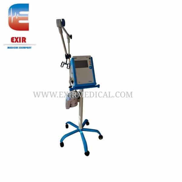 تحكّم إلكتروني في الـ PEEP وخلّاط الأوكسجين (O₂ blender).